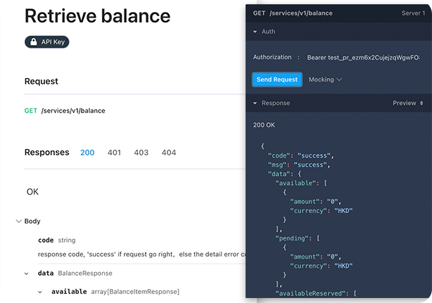 Money Collect provides a mock server with all of our powerful APIs. Get your test key from MoneyCollect Dashboard and send request directly from our API documentation, then our mock server will validate all your requests and respond with a dynamically generated response.