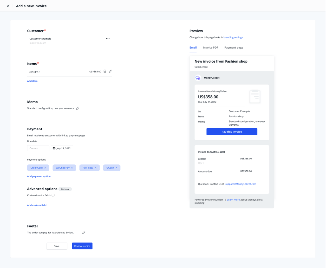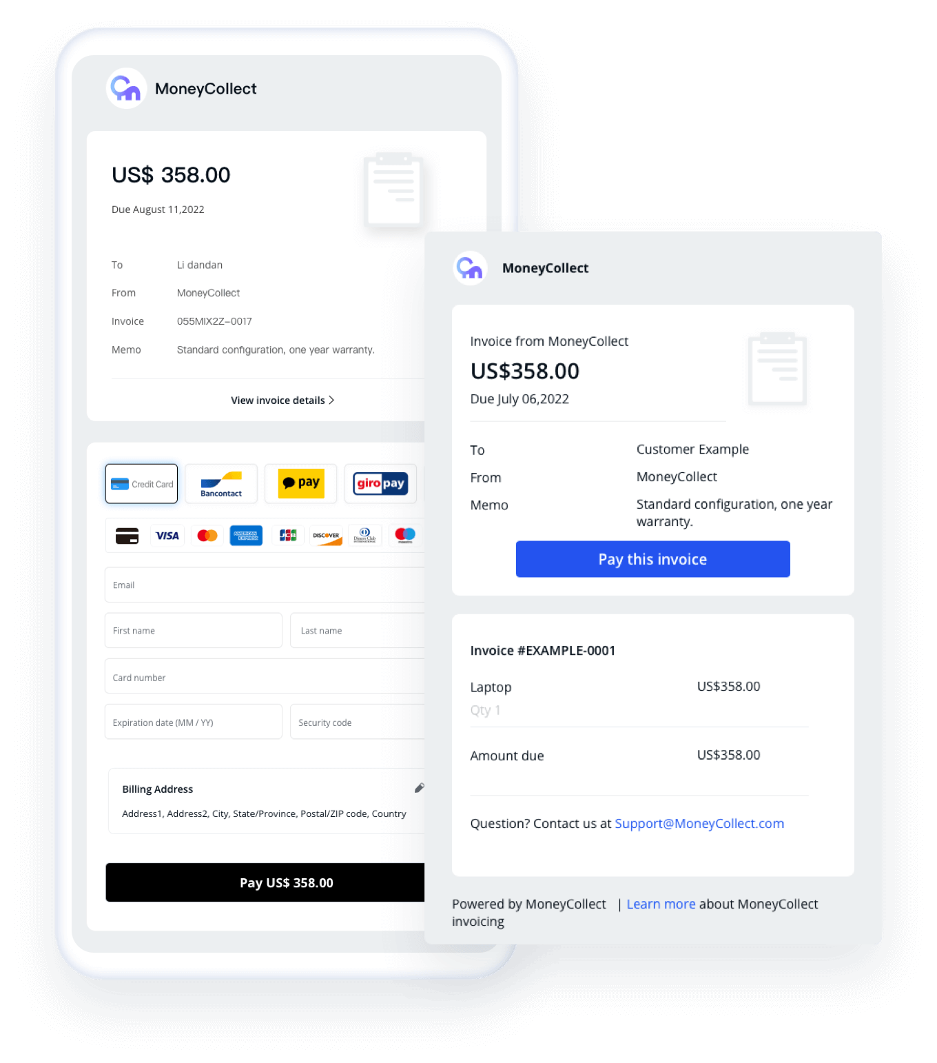 A professional invoice page can give customers a better impression,build trust in the brand, and encourage customers to complete payments. MoneyCollect lets you create professional invoices in few seconds.