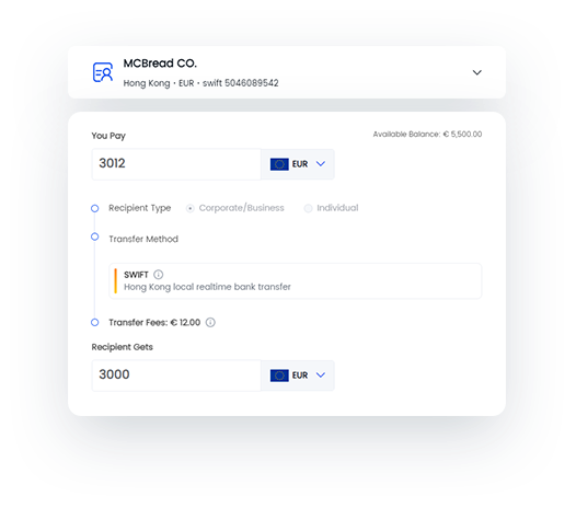 Send local and international payouts utilizing various methods, including wire transfer(swift), FPS, ACT, RTGS.